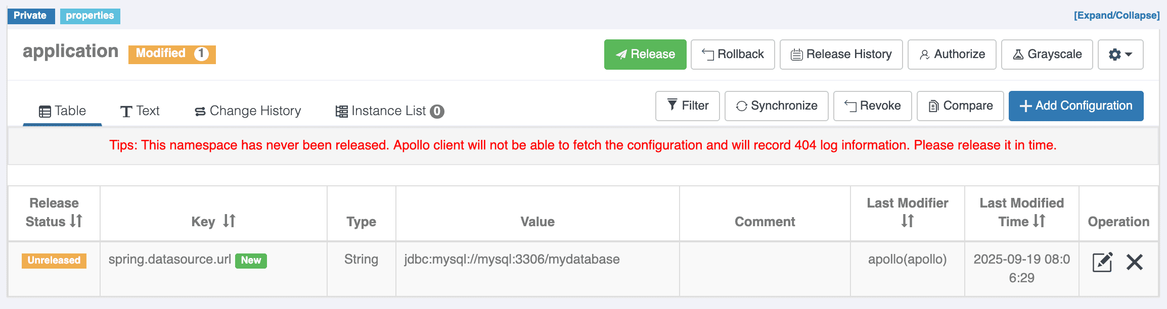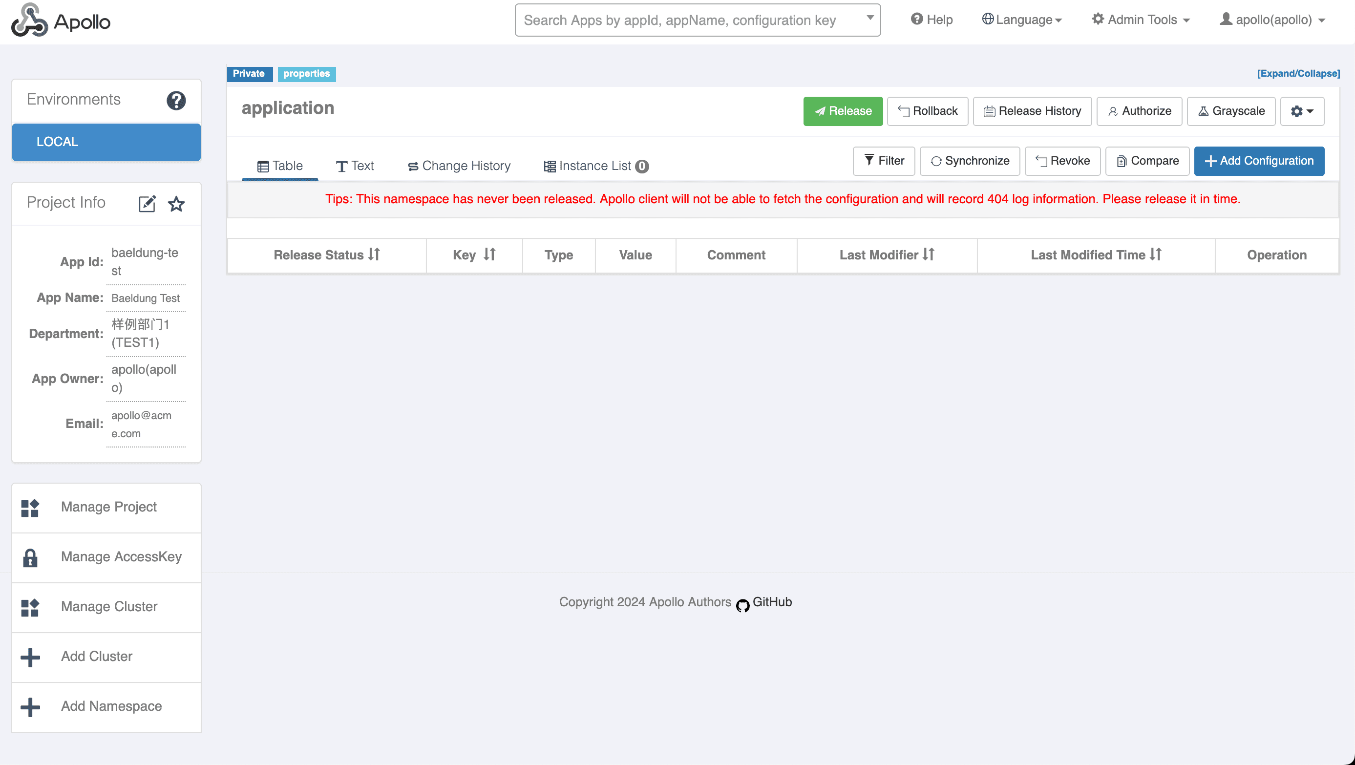 The apollo.meta property tells Spring where to find the configuration settings. The app.id property tells it the ID of the project within Apollo. The apollo.cluster property tells it the cluster to use within this project. If we omit this, or the cluster doesn’t exist, then it will fall back to default.