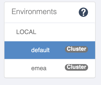 When we create a new cluster, we need to give it a unique name and select the set of environments within which the cluster exists. Not all clusters need to exist in all environments – our Dev environment might only use a single data center, whereas Production might use several. Note that our quick-start instance represents a single LOCAL environment.