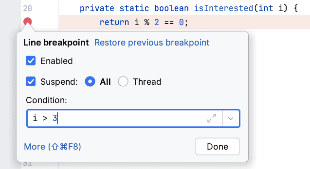 Now the debugger will stop on the breakpoint only if the given argument is greater than 3.