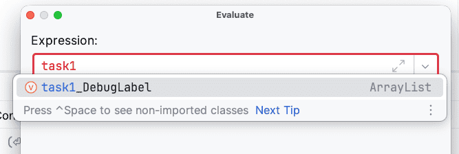 The cool thing is that even if a marked object is not reachable from stack frames at the moment, we can still see its state – open an Evaluate Expression dialog or add a new watch and start typing the mark’s name.