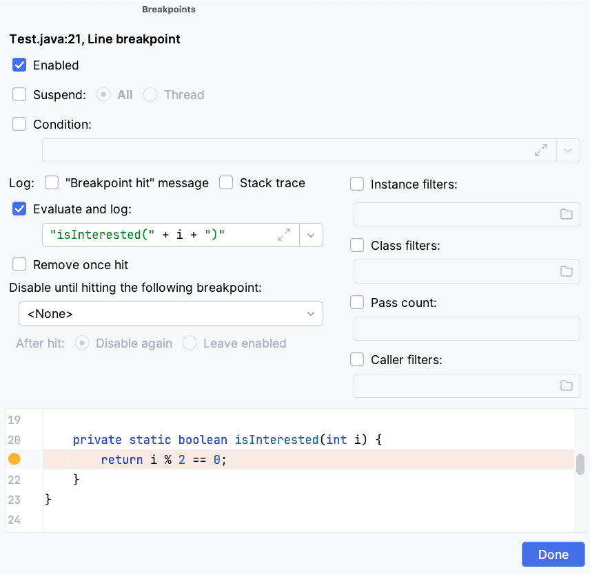 Let’s create a non-blocking breakpoint in the target method (Shift + left-click on the left editor gutter). After that let’s open its properties (right-click on the breakpoint) and define the target expression to log: