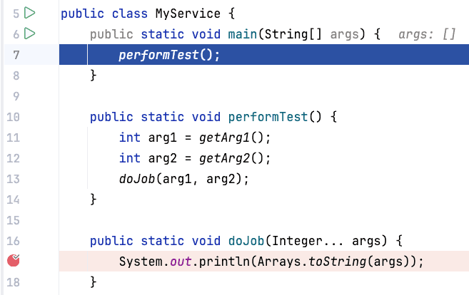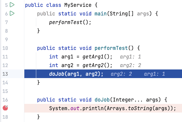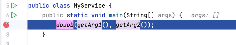 There are situations when multiple methods are called on a single line of source code, such as doJob(getArg1(), getArg2()). If we call Step Into action (F7), the debugger goes into the methods in the order used by the JVM for evaluation: getArg1 – getArg2 – doJob.