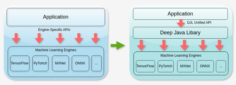 Applications that use ML Python libraries must rely on engine-specific APIs. This creates tight coupling, increasing complexity and maintenance overhead. By contrast, DJL is a lightweight library with minimal dependencies that enables applications to interact with the underlying ML engines transparently. Essentially, DJL does not replace ML engines, but it provides a unified Java API that delegates execution to the selected engine at runtime. As a result, switching between the libraries is seamless with minimal effort.