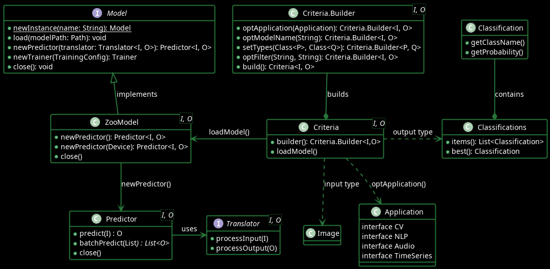 The Criteria.Builder class helps define ML model search criteria, such as the model name, model input and output arguments, and the model application, and then creates a Criteria object. The Criteria#loadModel() method then loads the ML model directly from the Model Zoo.