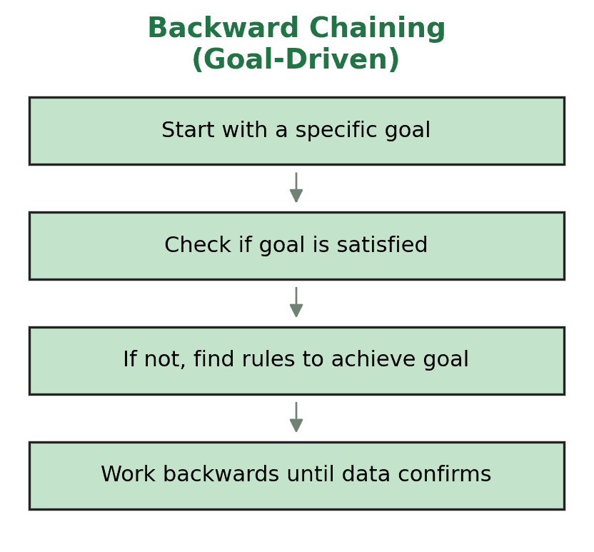 Backward chaining starts from a goal (Fact D), looks for rules that could lead to it, checks Rule 2, which needs Fact C, and recursively evaluates the necessary facts and rules.