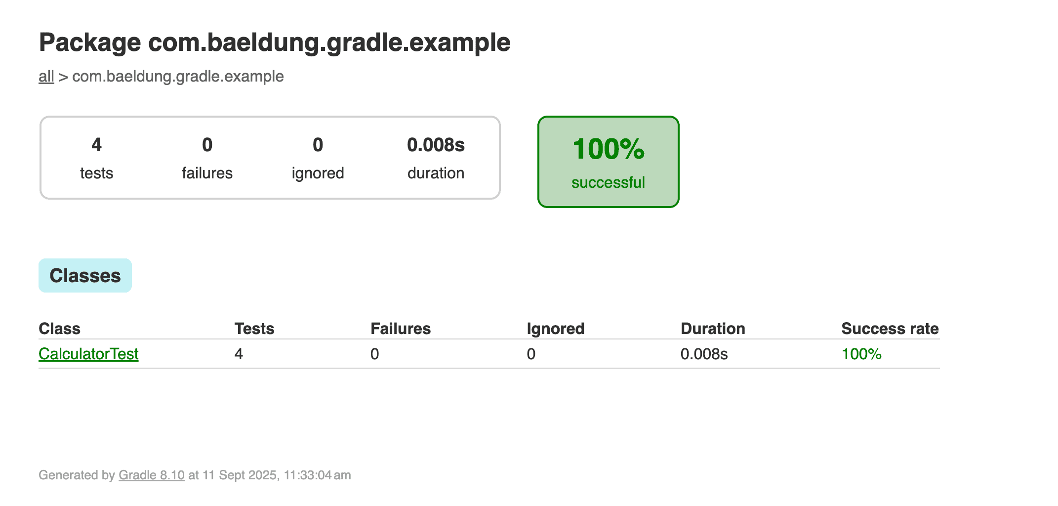 This ensures we have both XML and HTML reports available after each test execution. The HTML reports are generated by default in the build/reports/tests/test directory. This location contains an index.html file that serves as the main entry point for viewing test results. To demonstrate the HTML report generation, let’s create a simple Gradle project that exercises basic functionality.