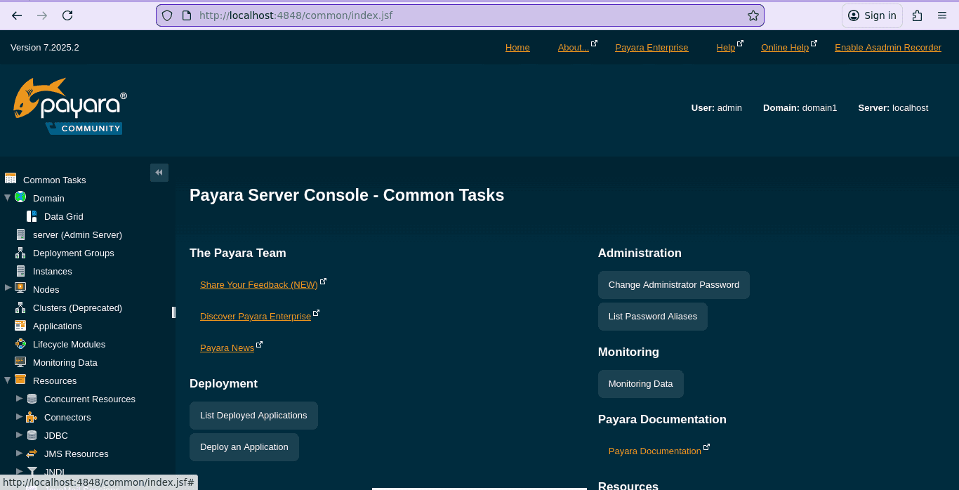 Additionally, we can access the admin console using the following URL: http://localhost:4848.
