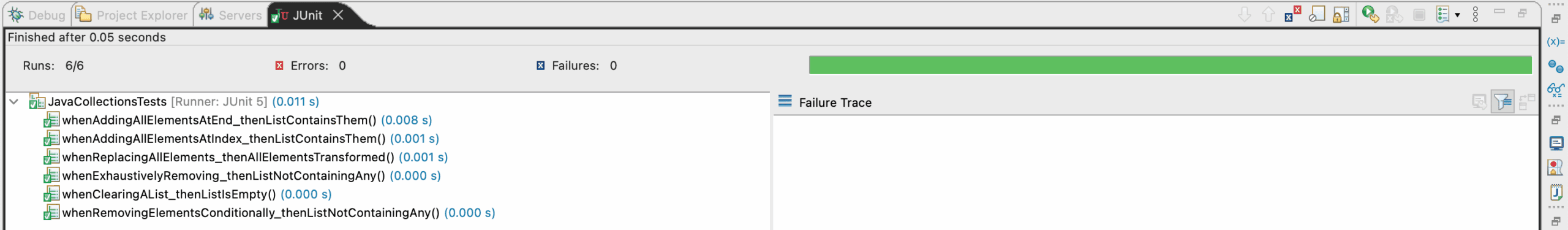 Let’s now dive into a few practical examples. For this lesson, we’ve included some JavaCollectionsTests test cases in the start module. These use a one-by-one manual looping approach first, so that we can clearly see how bulk operations improve both readability and efficiency.