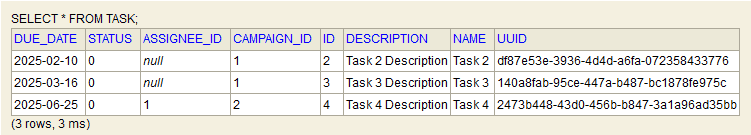 Let’s have a look at our database, open the H2 console, and execute the query to see all the records from the Task table: