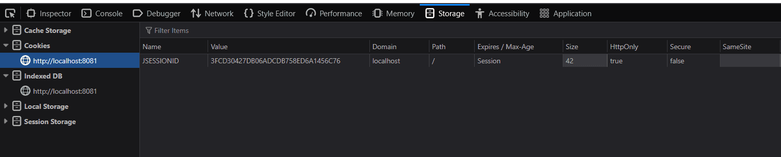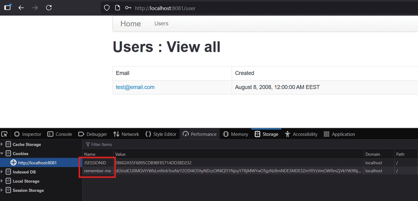 If we check our cookies again, we will see that the application has issued a new JSESSIONID. This confirms that the application successfully used the remember-me token to create a new session for us automatically.