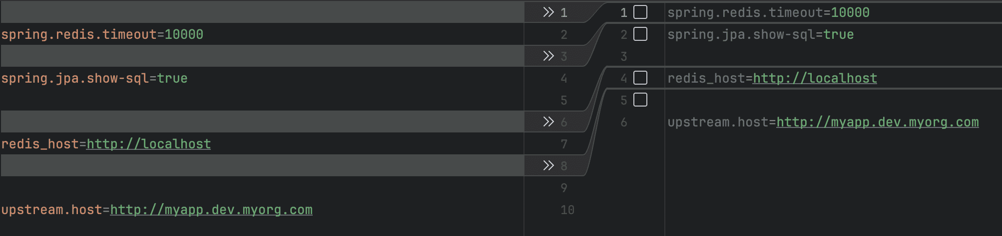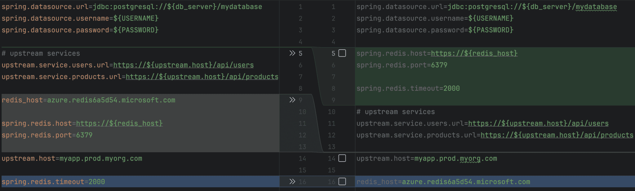 Then, let’s review the diffs for application-dev.properties using our version control software: