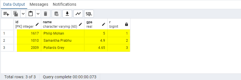 Here, we use the RANK() window function in a CTE to rank the students based on their GPA in descending order, excluding those with NULL GPAs. We save those ranks in the r column of the CTE. Then, in the main part of the query, we specify the condition r <= 3 to retrieve those with the top 3 scores: